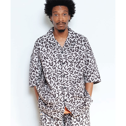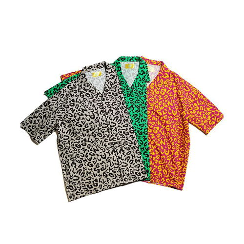 ブランドネームを豹柄にアレンジした総柄テキスタイルがポイント。