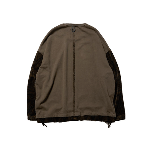 異素材の民族調の総柄生地を袖と裾に切り替えることで生まれたデザインがポイント。