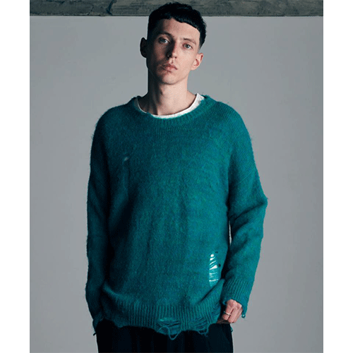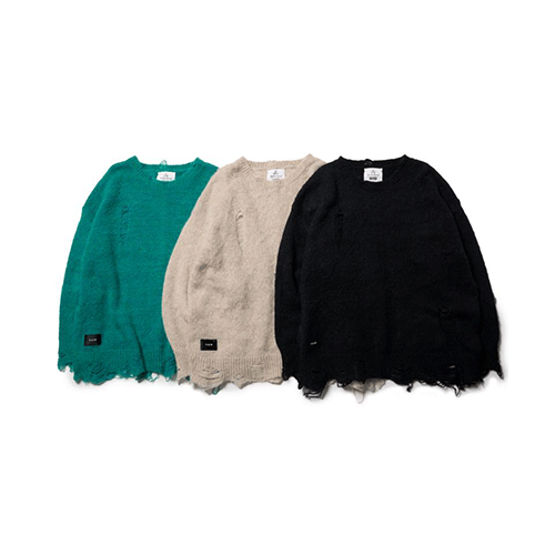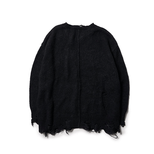 やや肉厚で毛足のある着心地でシンプルなデザインでありながらダメージ加工を施すことによりインパクトあるアイテムに仕上げられた一枚。