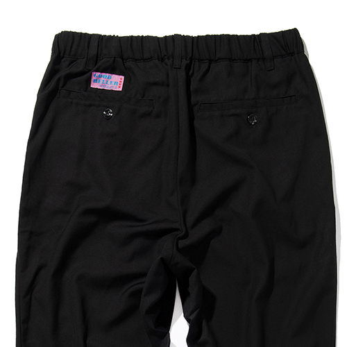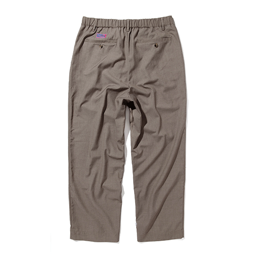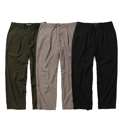 さらりとした履き心地の良いポリエステルとレーヨンの混合生地を使用し、シルエットは股上深め、ワンタックを入れのワタリから裾にかけてはワイドシルエットのクラシカルなストレートタイプをベースに。